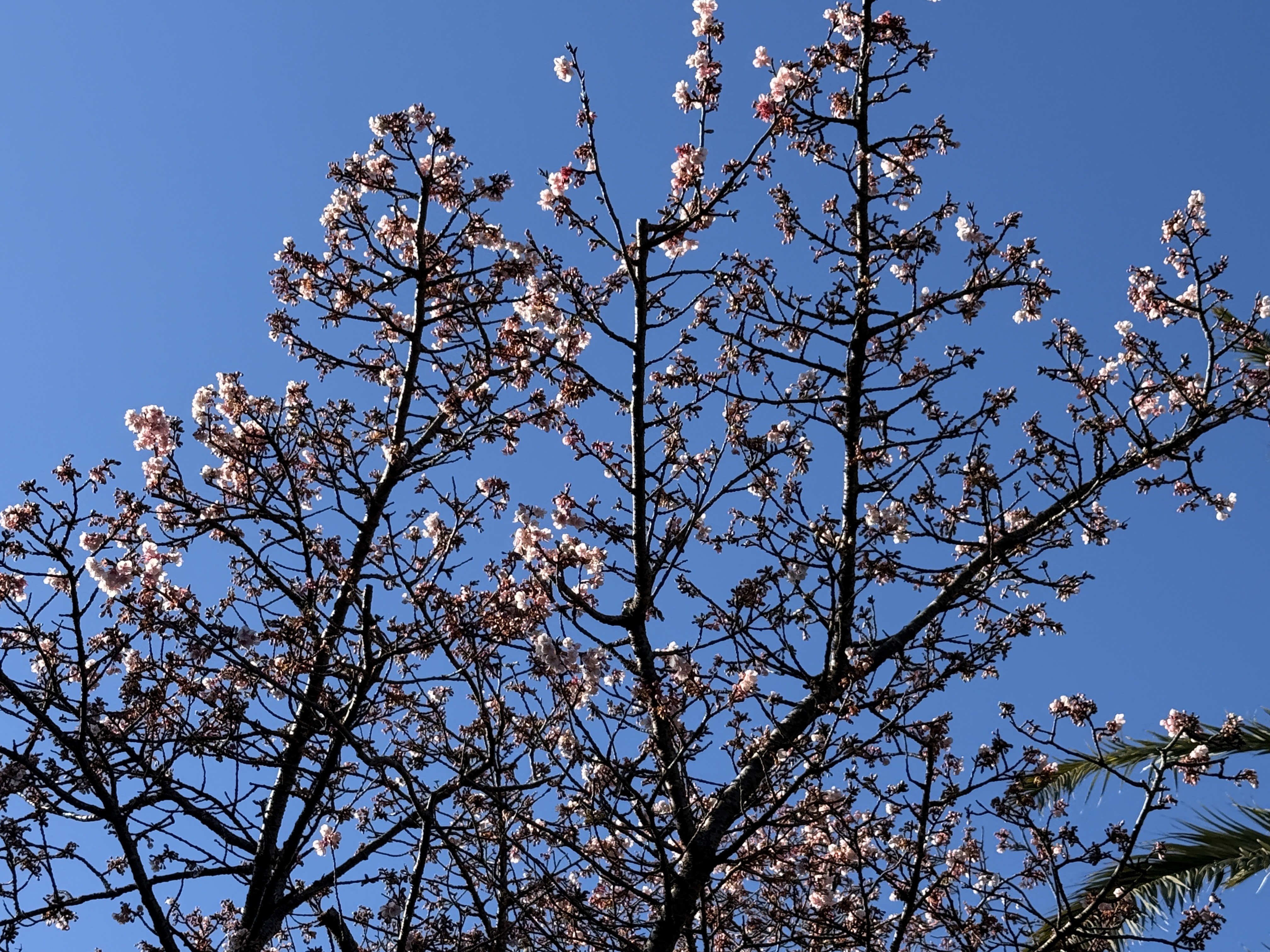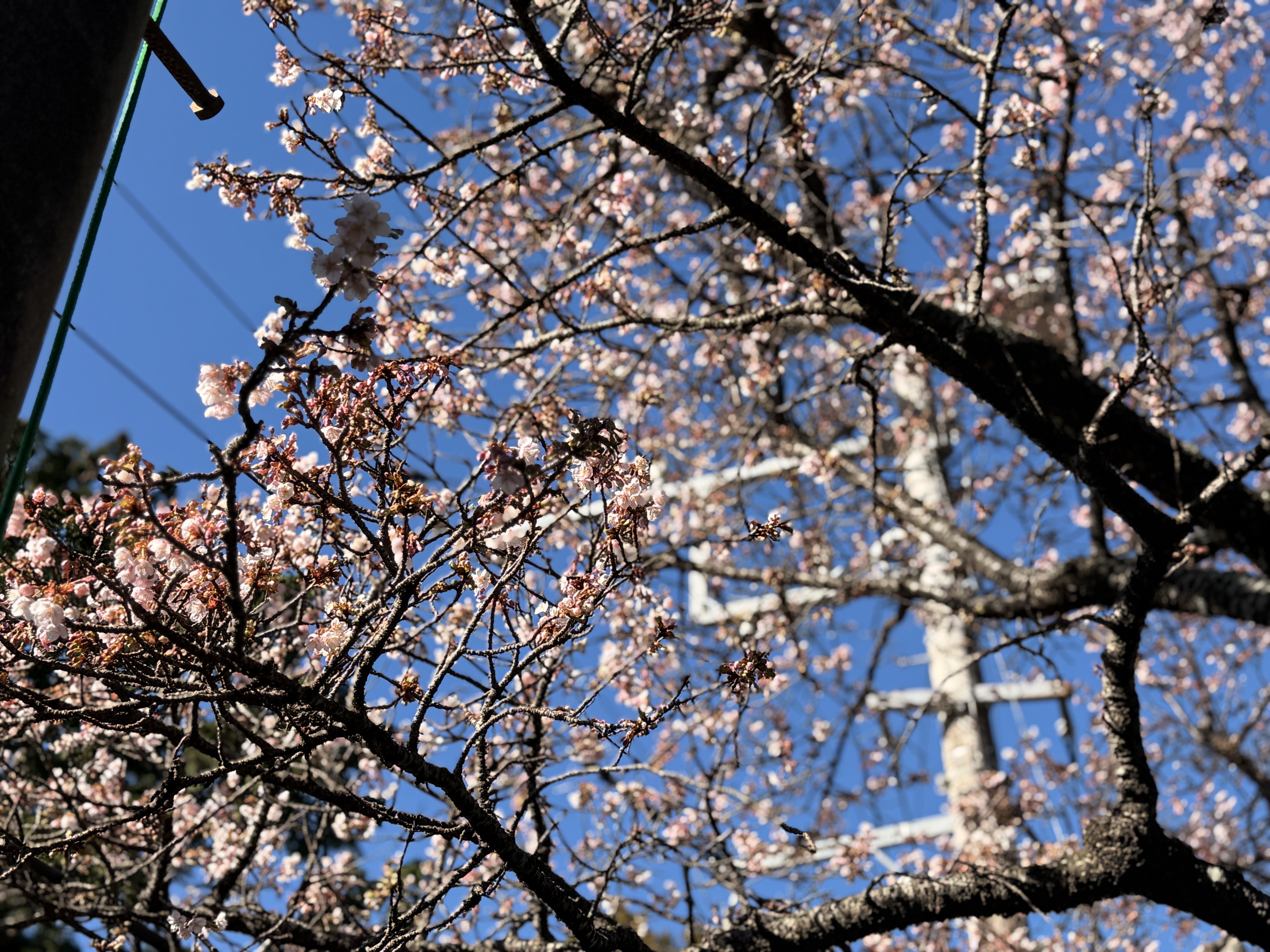 小室山リフト乗り場の前にあります早咲きの桜「寒桜」の開花が進んでおります。蜜を求めて集まるメジロの姿も多く見られ、一足早い春の訪れを告げています。