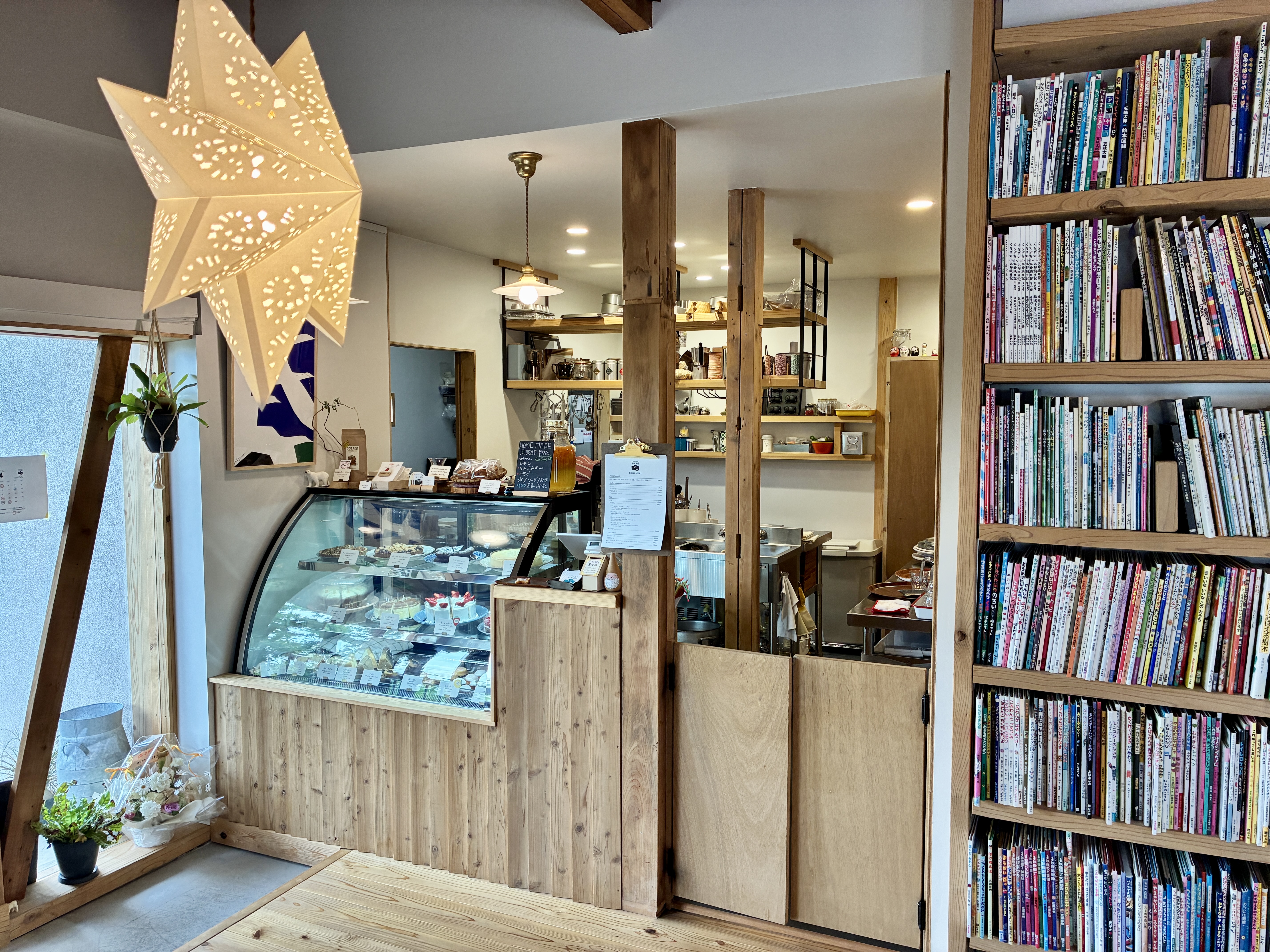 木のぬくもりを感じる店内には、お洒落な星の大きな照明や淡い色味のクッションが並べられていて、玄関で靴を脱いで上がるのでお家に遊びにきたような気分になりました。