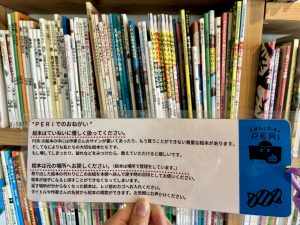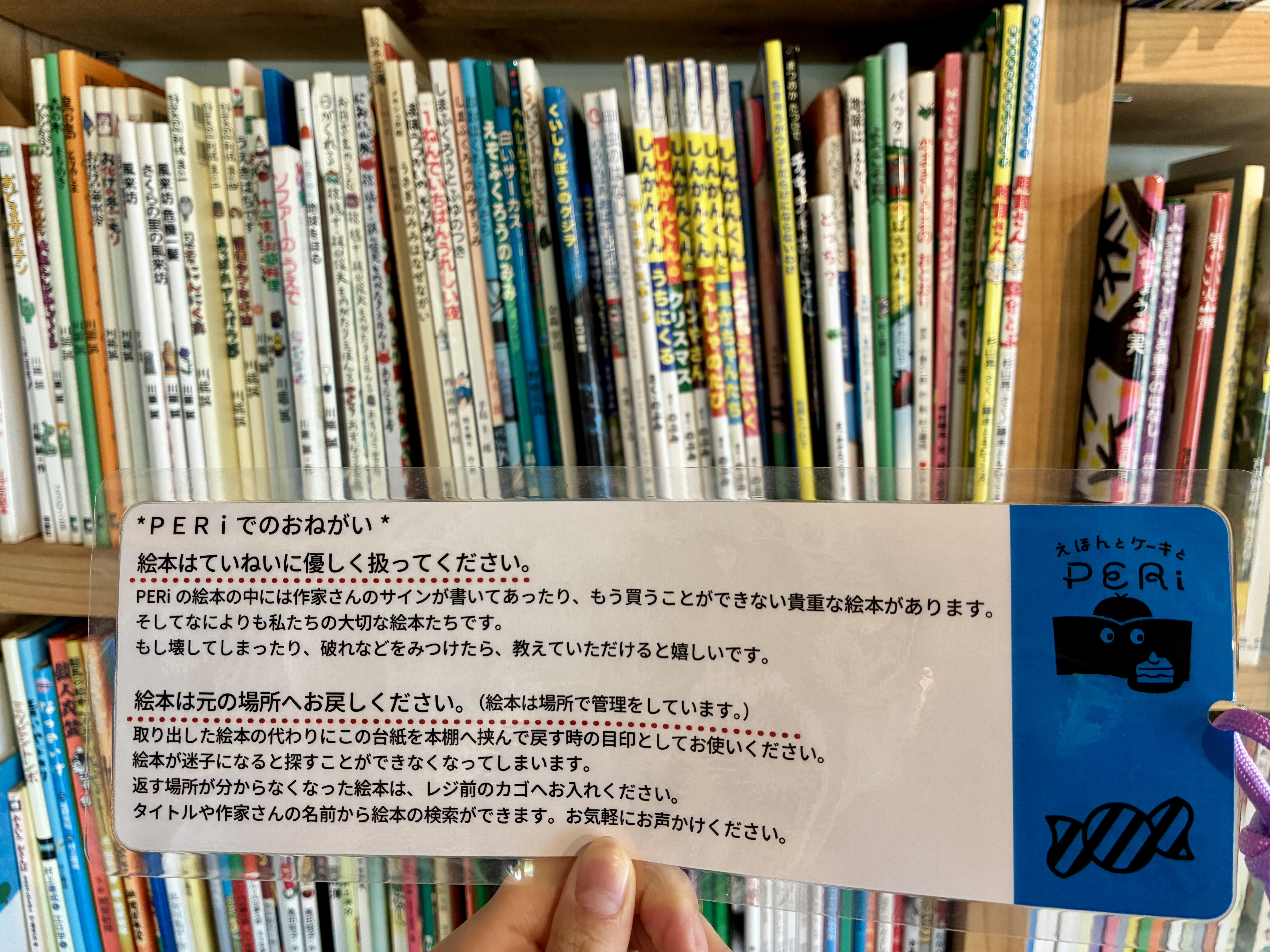 どこに戻せばいいのか忘れないよう、絵本を選んだら、注文時に渡していただいたこちらの栞を挟んでおきます。