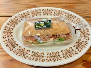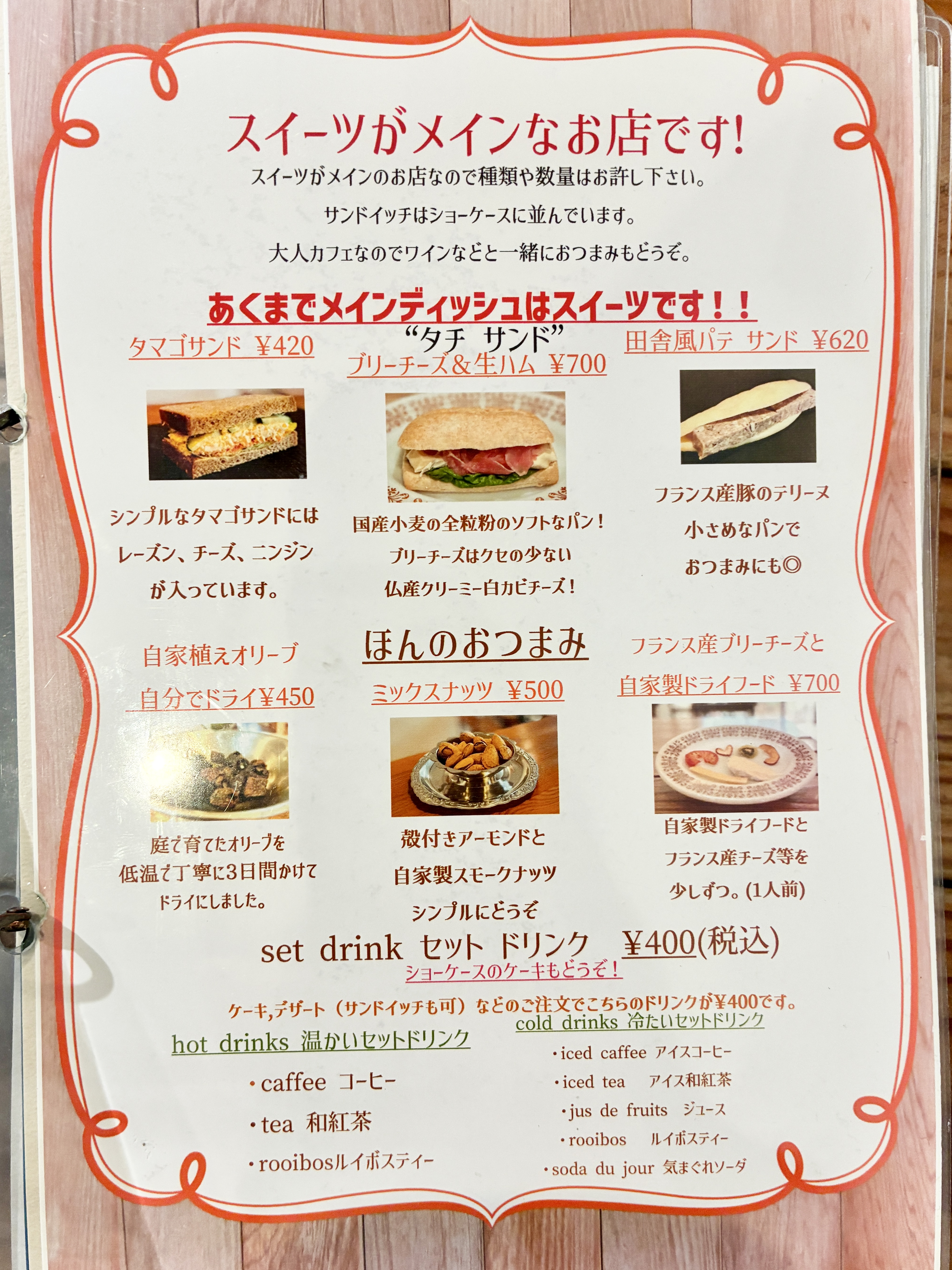 メニューに「あくまでメインディッシュはスイーツです!」とあるように、生ハムとブルーチーズが入ったサンドはコンパクトサイズ。パンもケーキも食べたいよくばりな私にはぴったりのサイズ感でした。ワインなどアルコールもあるそうで、夜はそちらと合わせて頂くのもいいですね!