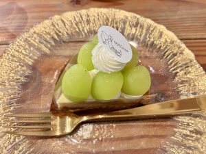 ケーキはシャインマスカットのタルトを注文。レモン風味のチーズケーキに甘いシャインマスカットがのっていました。生クリームも甘さ控えめで美味しくいただきました。
