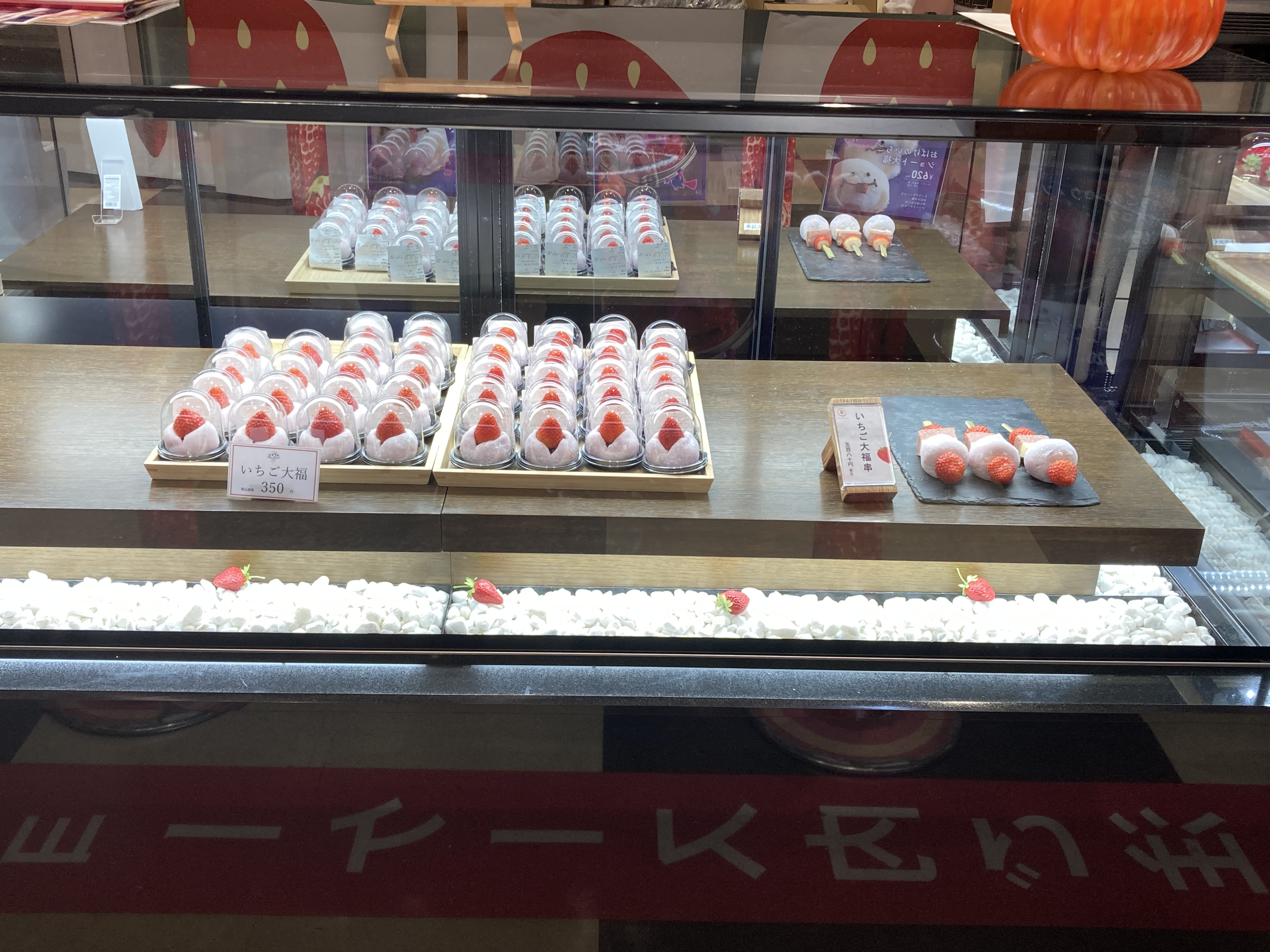 店内には苺のお菓子やジャムなどをはじめ、ショーケース内には出来立てのケーキや大福などが販売されております。