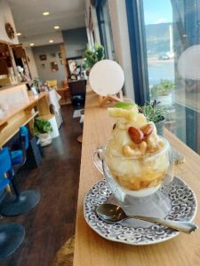 バニラとヨーグルト、二種類のアイスの上にナッツとフルーツとたっぷりのハチミツがかかったアイスで、お店の看板メニューだそうです!